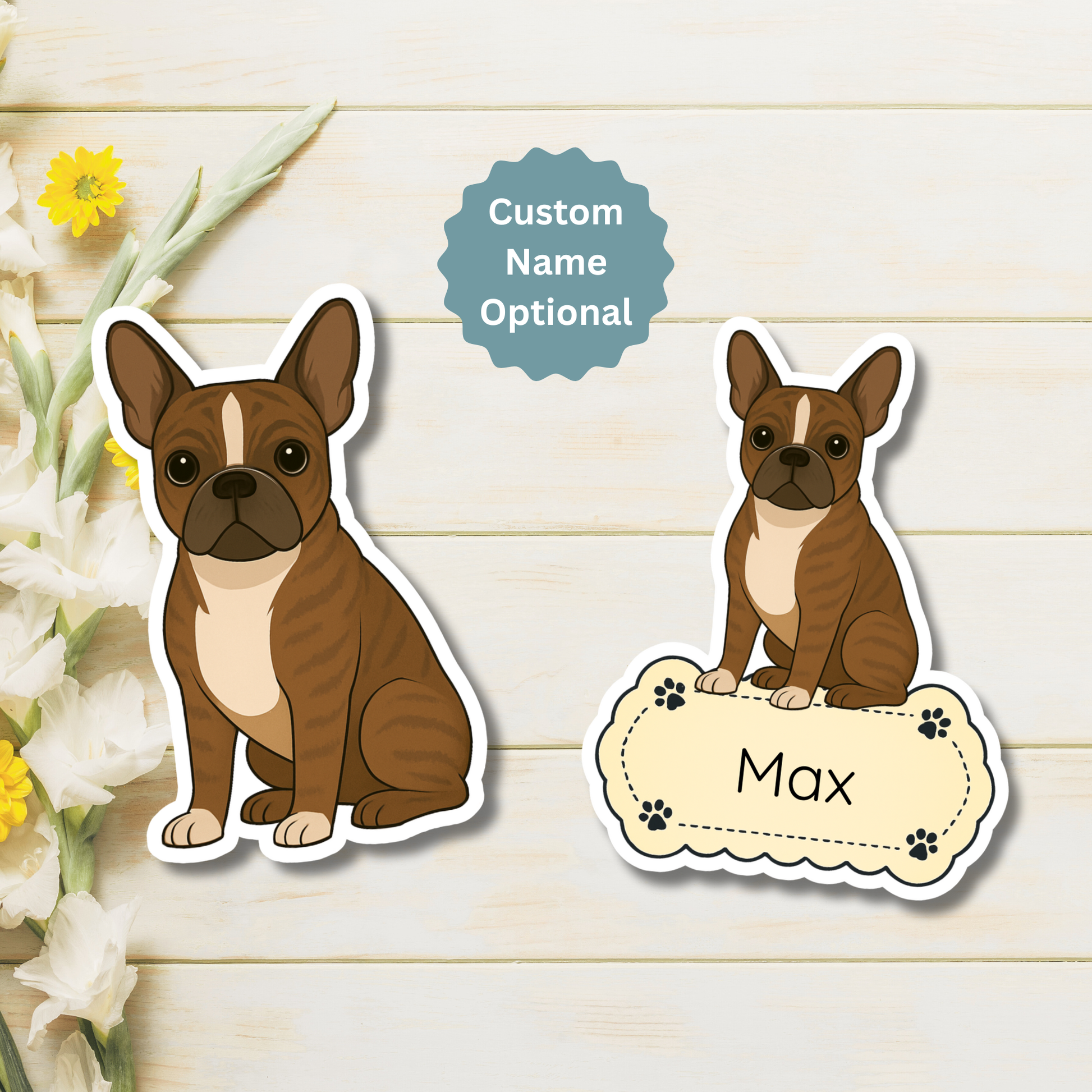 Aimant personnalisé Boston Terrier – Bringé et blanc | Personnalisable avec le nom de l'animal
